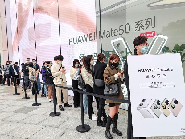 11月10日,华为全新小折叠手机华为Pocket S全渠道开售,售价5988元起。华为Pocket S不止技术创新,更侧重于年轻化的潮流表达,凭借着超凡体验与时尚美学,备受广大消费者,尤其是年轻时尚女性人群的青睐。产品发布以来,各大电商平台持续升温,线上掀起抢购浪潮。首销当天,线下门店销售情况同样火爆,不少消费者前往门店排队购机。