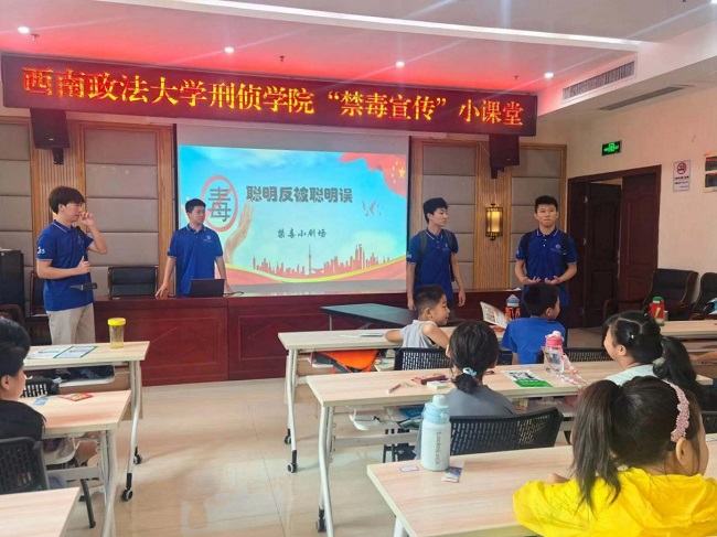 在江津区少年宫,实践团成员为青少年们上演精心准备的《聪明反被聪明误》禁毒情景剧,直观展示了毒品的危害,随后用青少年涉毒的案例向小朋友们讲解了毒品的分类和危害,结合问答进一步巩固了孩子们对禁毒知识的了解。