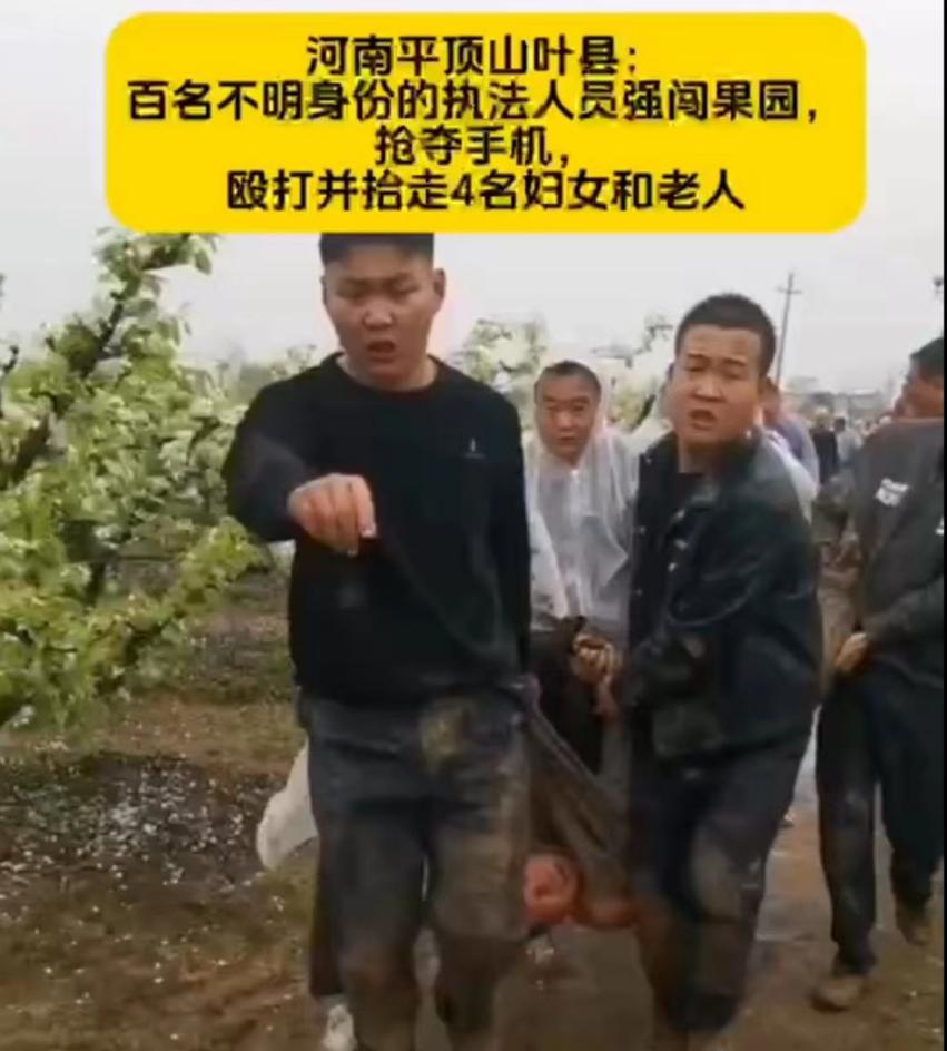 2024年4月2日上午7时,正是河南省委驻叶巡视期间,梨园四周突然聚集了特警、交通、城管、120、综合执法等各类车辆100多台,勾机三台,叶县县委常委、常务副县长胡炜ff哲等领导率领三四百人对果园强拆,几十名身份不明的执法人员对我家上前录像取证的四名妇女和老人按倒在泥地里,抢走手机,抬出果园后关进了派出所。