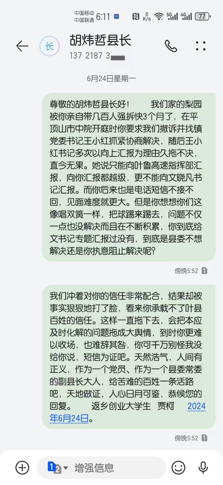 随后大学生贾柯先后给叶县县委书记文晓凡,叶县常务副县长胡炜哲发短信,均是石沉大海,杳无音信。