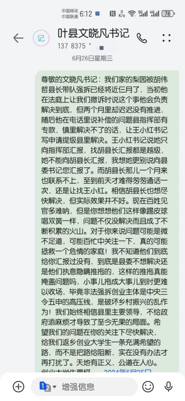 叶县大学生创业果园被强拆(三):喊话文晓凡书记,敦促当地政府依法纠错补偿