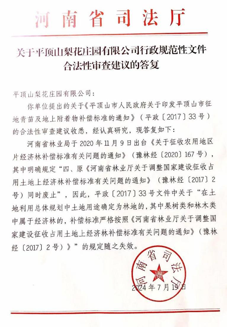 我是河南叶县任店镇梨花果园大学生创业基地负责人贾柯,今年七月二十三日上午,我终于接到了日思夜盼的省司法厅寄来的关于平顶山梨花庄园有限公司行政规范性文件合法性审查建议的答复。答复内容如下。