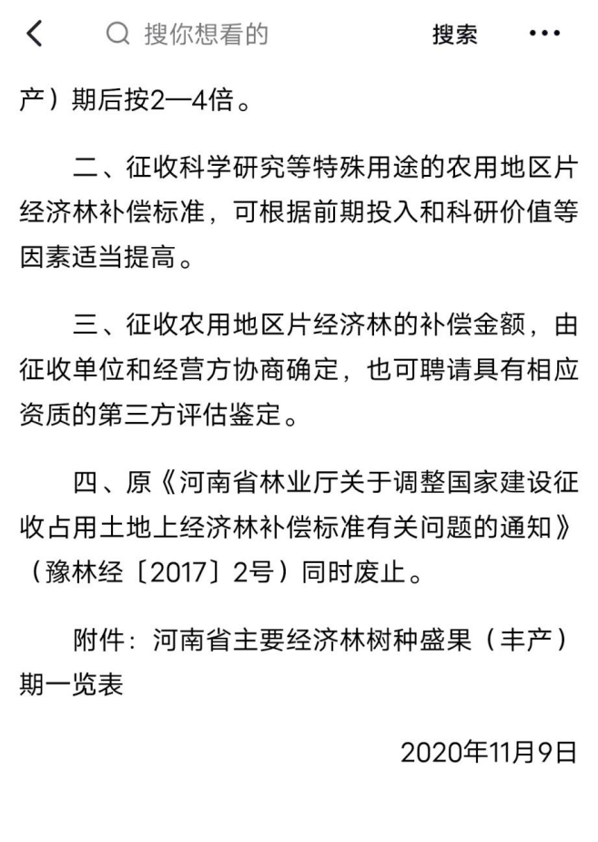 关于《平顶山市人民政府关于印发平顶山市征地青苗及地上附着物补偿标准的通知》(平政〔2017]33号)中,有关经济林标准认定中规定,在土地利用总体规划中土地用途确定为林地的,其中果树类和林木类中属于经济林的确定标准显然于法无据,平顶山33号文件的这条规定其实在2020年就应该废止了,可是为什么作为平顶市一级政府却没有及时对于33号文件进行更正呢?我无从得知。然而,叶县当地政府为什么坚持(平政2017]33号中已经失效的条例不放,坚持不按照我的盛果期经济林赔偿,最后导致在省委巡视组驻叶县期间,果园被非法强拆,导致我家果园至今赔偿无果的局面。