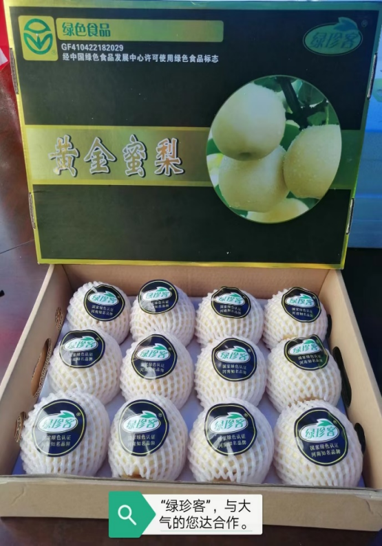 叶县的大学生贾柯自创果园,并成立公司、注册商标实施品牌经营。先后通过银行贷款、家人支持和亲友筹措等途径,对梨园进行了大力持续投资,聘请外地农艺师团队驻园实施精细化管理。“绿珍客”黄金梨以卓越的品质收到比普通的梨高出数倍的回报,在市场上卖出了8块钱一斤的好价钱。并于2018年通过农业农村部中国绿色食品发展中心的绿色食品认证。