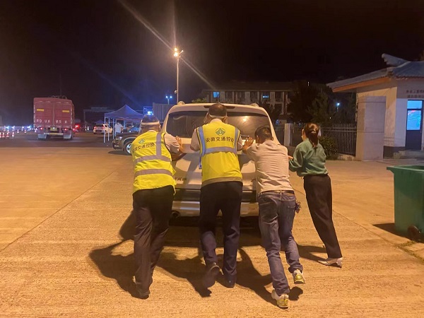 “您好,请问需要热水吗?”他们推着爱心服务车,免费为司乘人员送上热水、泡面等应急食品。一句句热情的话语,一声声贴心的问候,舒缓了司乘人员急躁的情绪,换来一声声的感谢。