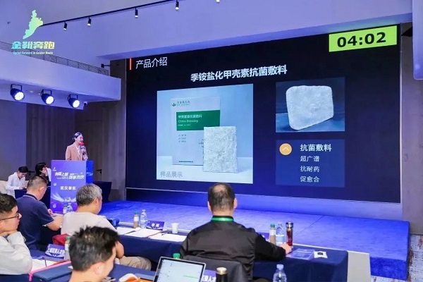 此外,常春藤天成生命科技公司带来的《甲壳素基高端抗菌敷料》项目聚焦于生物医用材料产业,项目团队均来自武汉大学。据胡先生介绍,团队目标产品为季铵盐化甲壳素基抗菌材料,甲壳素作为自然界唯一带正电的碱性多糖,可用于制备功能凝胶、高效吸附材料、生物支架、生物传感器和创伤敷料等,填补了市场上兼具广谱抗菌性强且生物安全性佳的医用抗菌材料的空白。