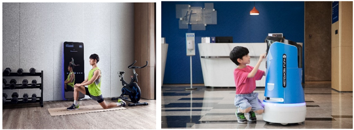 全方位打造“智联无限”的旅宿环境,包括健身魔镜、机器人送物自助服务等